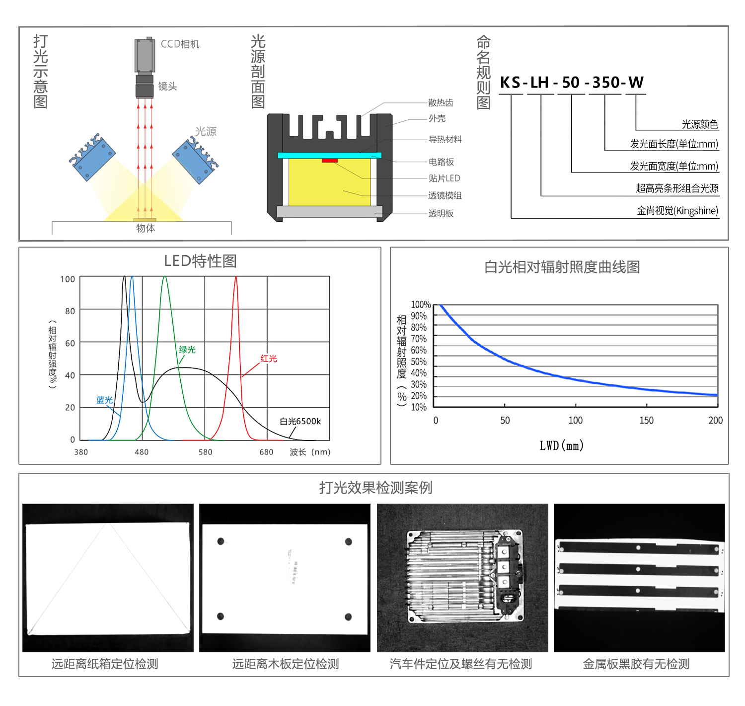 采用大功率LED和聚光透鏡,亮度高,實現遠工作距離照明;